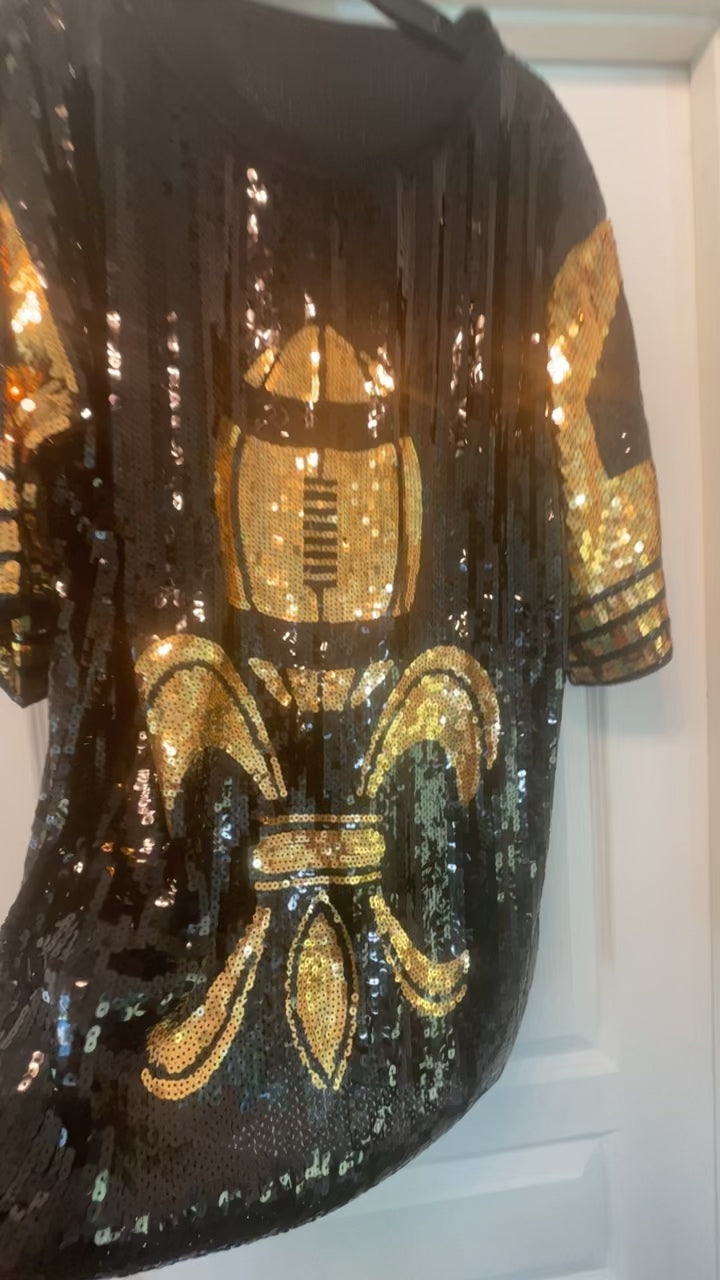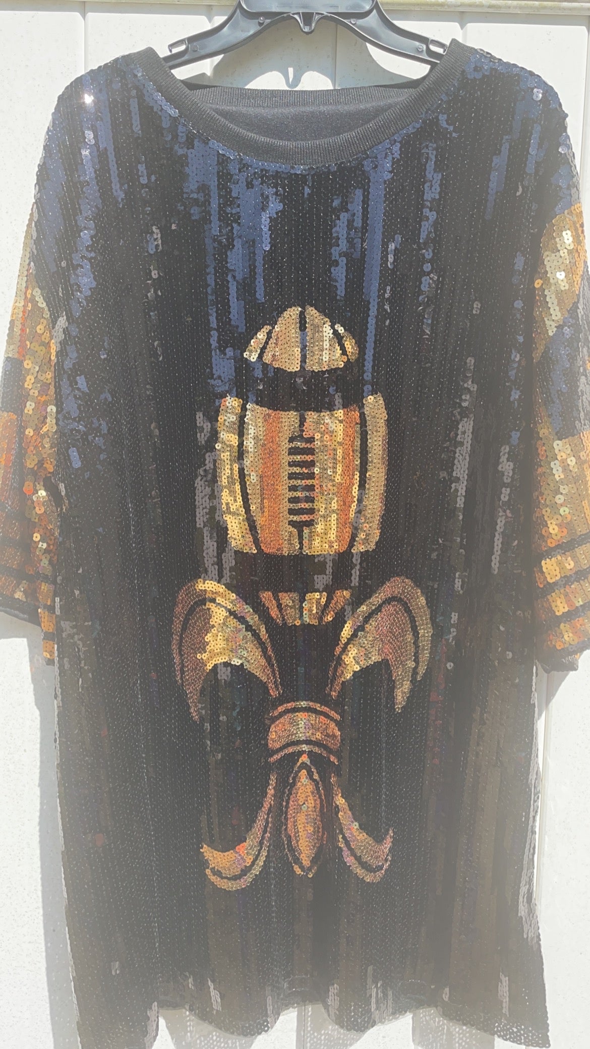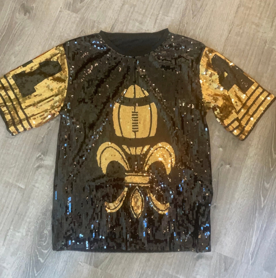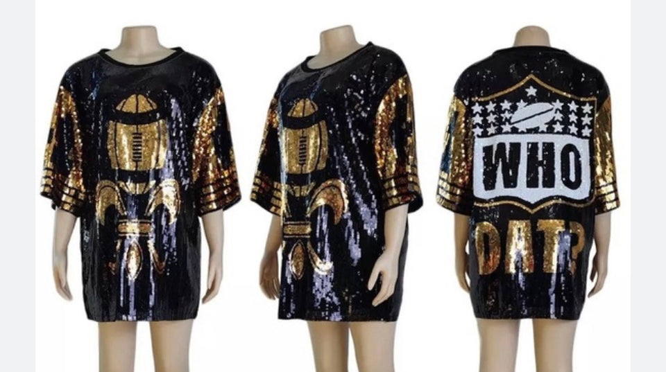 Are you a die-hard New Orleans Saints fan who loves to make a bold statement both on and off the field? If so, our Sequin New Orleans Saints Dress (one size fits most) is the perfect addition to your game day wardrobe! Get ready to Dazzle and showcase your team spirit in the most glamourous way Possible. This eye catching dress is adorned with shimmering sequins that catch the light from every angle. The sequins create a mesmerizing effect, adding a touch of glamour and sophistication to your Saints game day attire. Whether you are cheering from the stands or attending a game day party, this dress is sure to turn heads and make you the center of attention. Shine Bright from across the stadium or any day with this beautiful Black and Gold Game Day Jersey. Sequin Dress Linen Lining Mid Sleeve Crew Neck 100% Polyester One Size Fits Most Length 31.5” Bust 47” Dry Clean Only