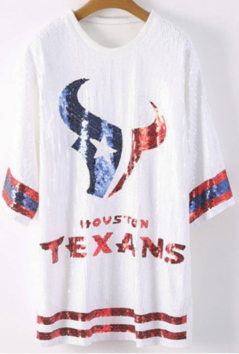 The ultimate game day fashion statement that combines team spirit with glamorous style! Get ready to dazzle in the stands and turn heads with every step you take. Sparkling Sequin Magic: This dress is adorned with high-quality sequins that shimmer and shine with every move. Stand out from the crowd and let your Texans pride sparkle like never before! 🏈 Show Your Team Love: Whether you're watching the game at the stadium, hosting a watch party, or cheering from your living room, this jersey dress is the perfect way to express your unwavering support for the Houston Texans. 👗 Comfort Meets Style: Made from soft and breathable materials, our jersey dress ensures all-day comfort while looking fabulous. It's not just a statement piece; it's a comfortable and versatile addition to your wardrobe. 🔥 Trendy and Versatile: This dress isn't just for game day! Pair it with sneakers for a casual chic look, or dress it up with heels and accessories for a night out. It's a versatile piece that suits any occasion. 🎁 Perfect Gift Idea: Searching for the ideal gift for the Texan fan in your life? Look no further! Our sequin jersey dress is a unique and thoughtful gift that'll have them cheering in style.