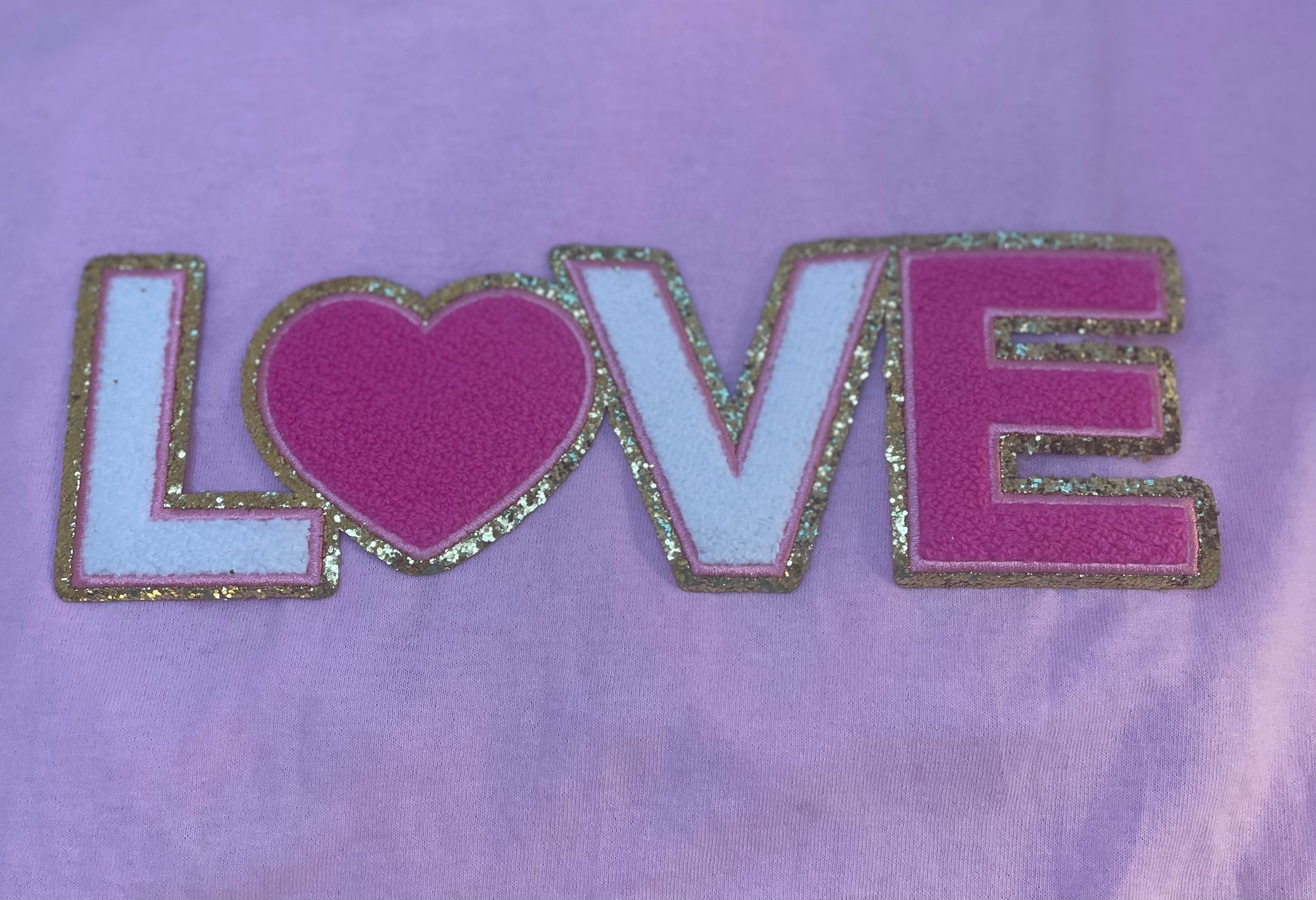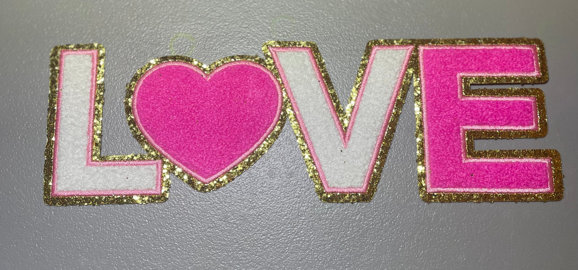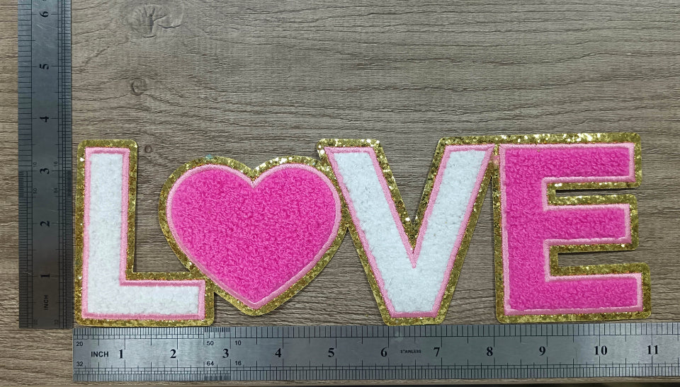 Love Iron On Chenille Patches with Gold-Glitter Edging - 11" Valentine's Day Love Chenille Patches - Heart Patches - Love Letter Patches
