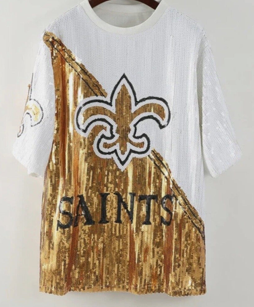 Are you a die-hard New Orleans Saints fan who loves to make a bold statement both on and off the field? If so, our Sequin New Orleans Saints Dress (one size fits most) is the perfect addition to your game day wardrobe! Get ready to Dazzle and showcase your team spirit in the most glamourous way Possible. This eye catching dress is adorned with shimmering sequins that catch the light from every angle. The sequins create a mesmerizing effect, adding a touch of glamour and sophistication to your Saints game day attire. Whether you are cheering from the stands or attending a game day party, this dress is sure to turn heads and make you the center of attention. Shine Bright from across the stadium or any day with this beautiful Black and Gold Game Day Jersey. Sequin Dress polyester Lining Mid Sleeve Crew Neck 100% Polyester
