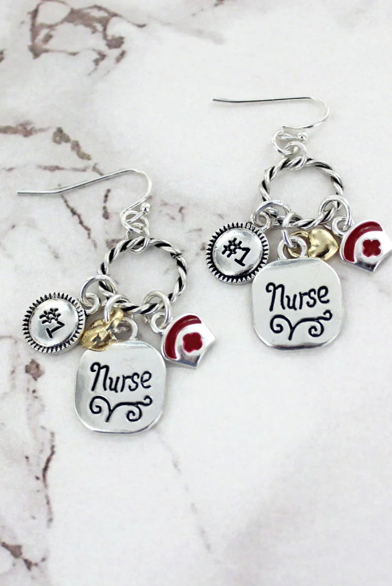 These two toned Nurse charm twisted hoop earrings are perfectly paired with that perfect outfit or a great pair of scrubs.