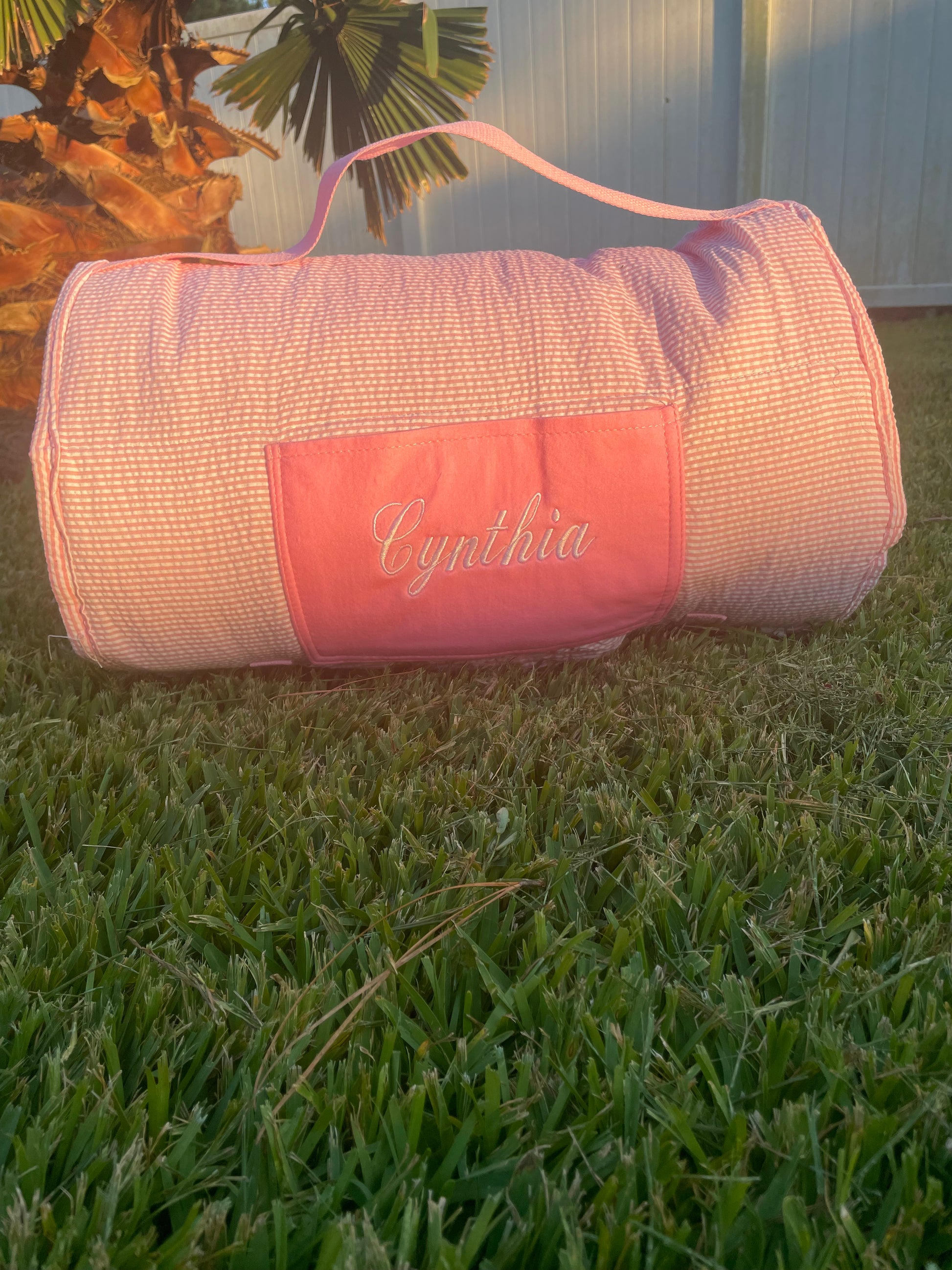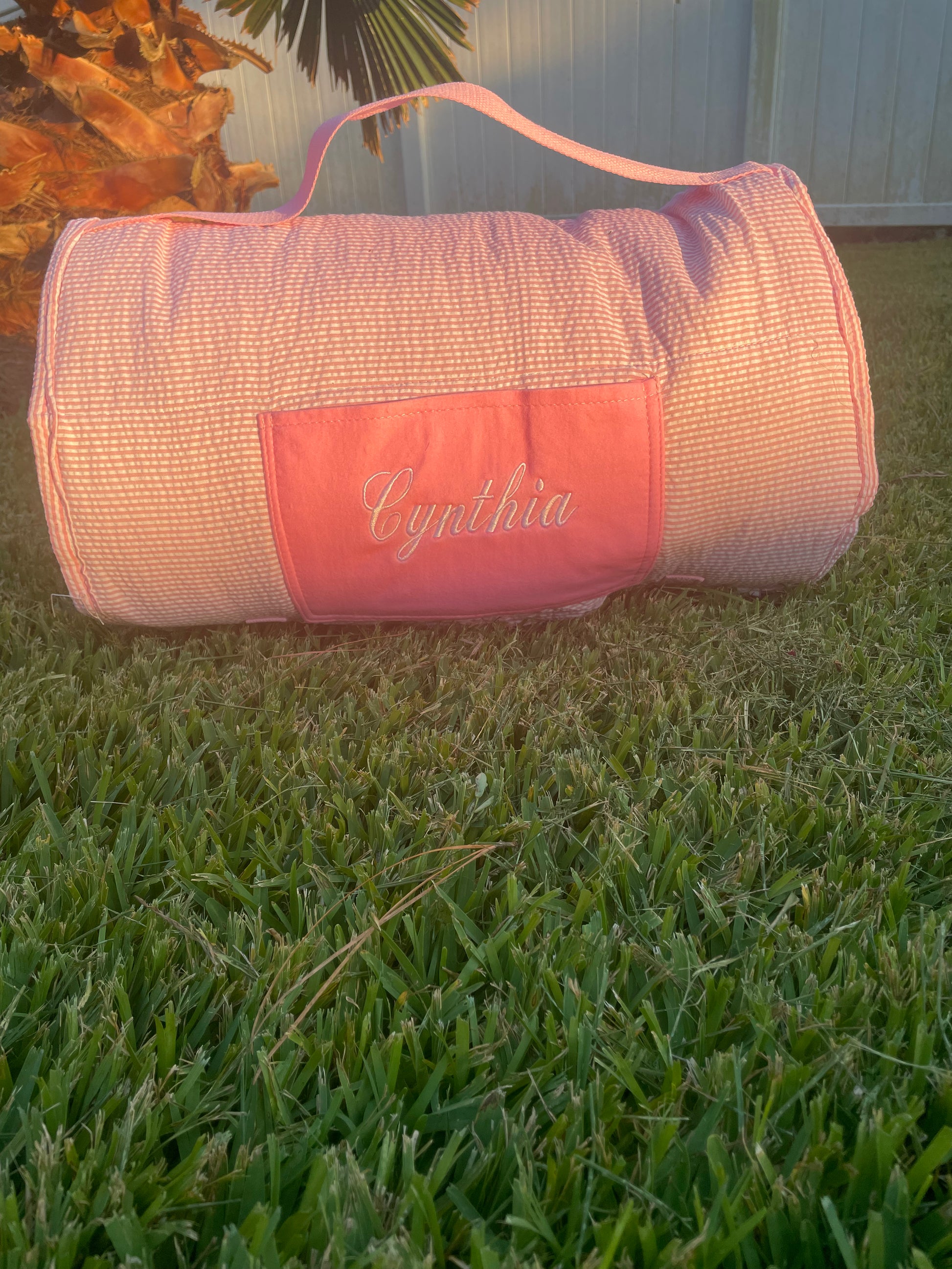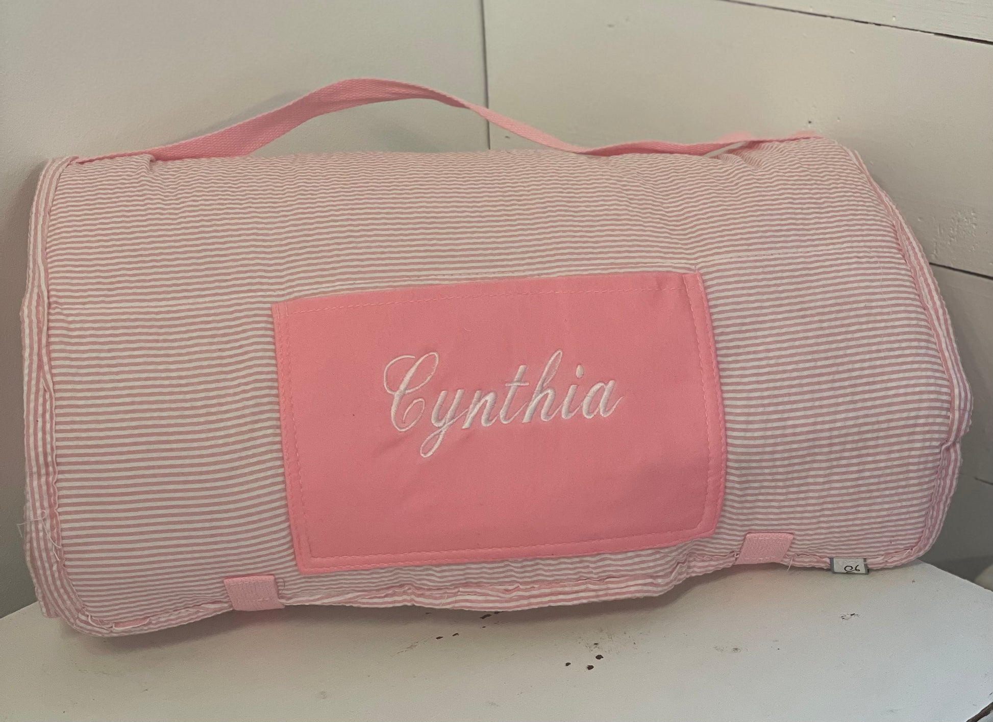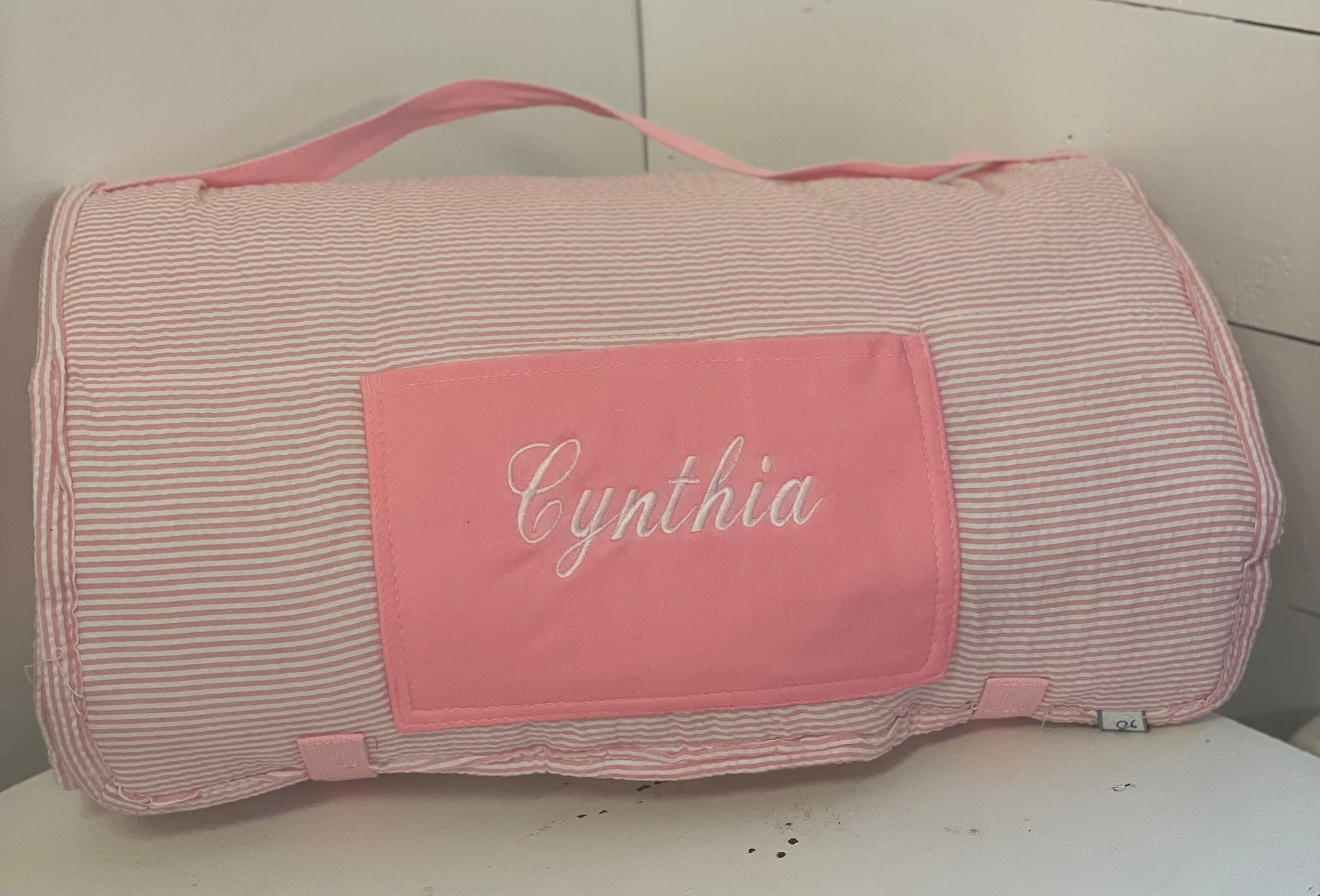* Pillow Included * 49in x 19in (Blanket 28.5in) * Outside Pocket * Velcro Closure. Monogram personalization Included. Toddler Nap Mat, Boys, Girls Nap mat, Kids Sleep Mat for School, Seersucker, Daycare, Pre-k, Preschool, Personalized, Embroidered, Pink.