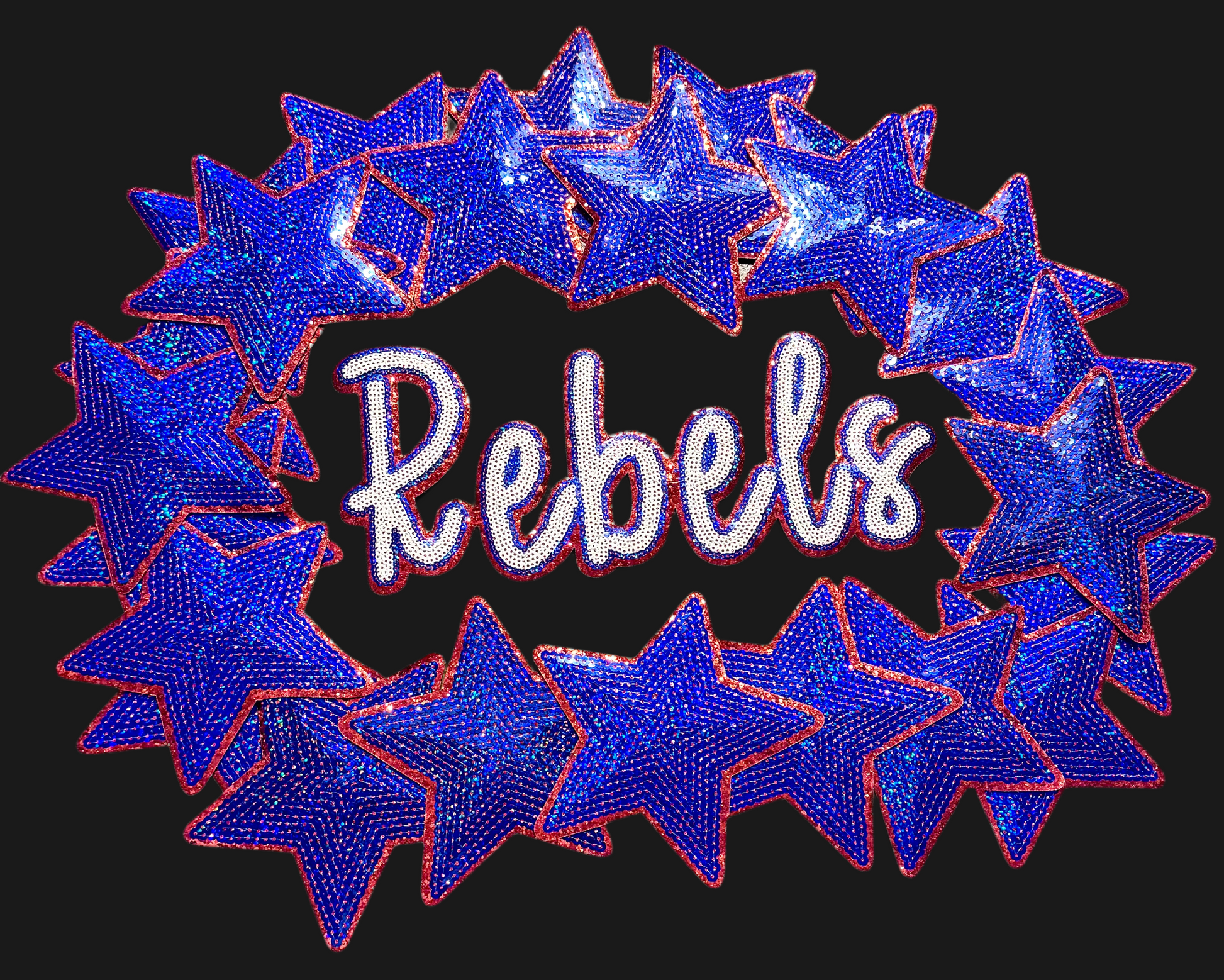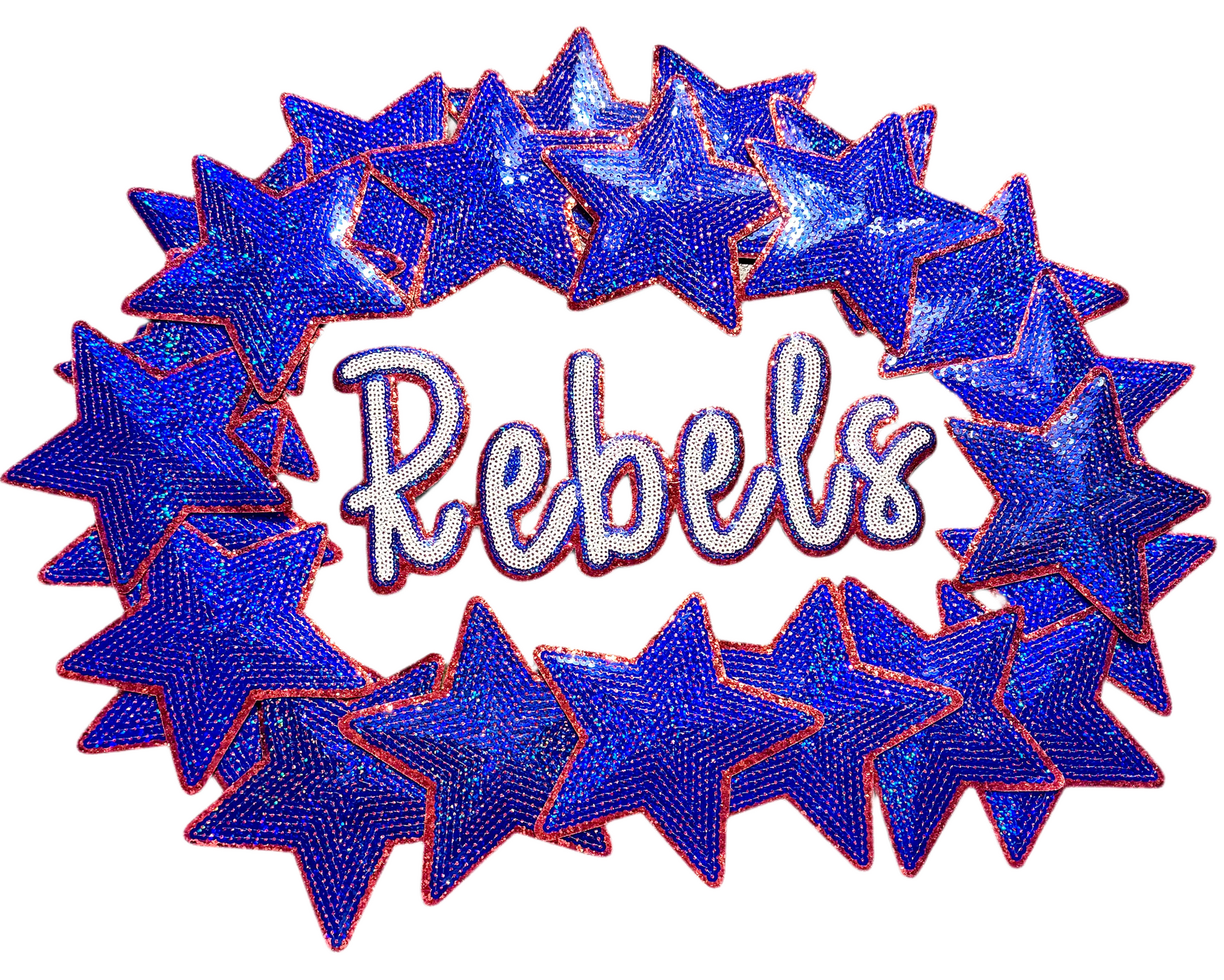 Red, Royal Blue and White Rebels Sequin Game Day Iron On Patch. size 11in wide x 4.5in height. Royal blue sequin star size 5 inches wide with Red glitter backing. These come with adhesive iron on backing that is heat activated, we recommend applying with a heat press. Can be used on: - Hats - Apparel - Bags
