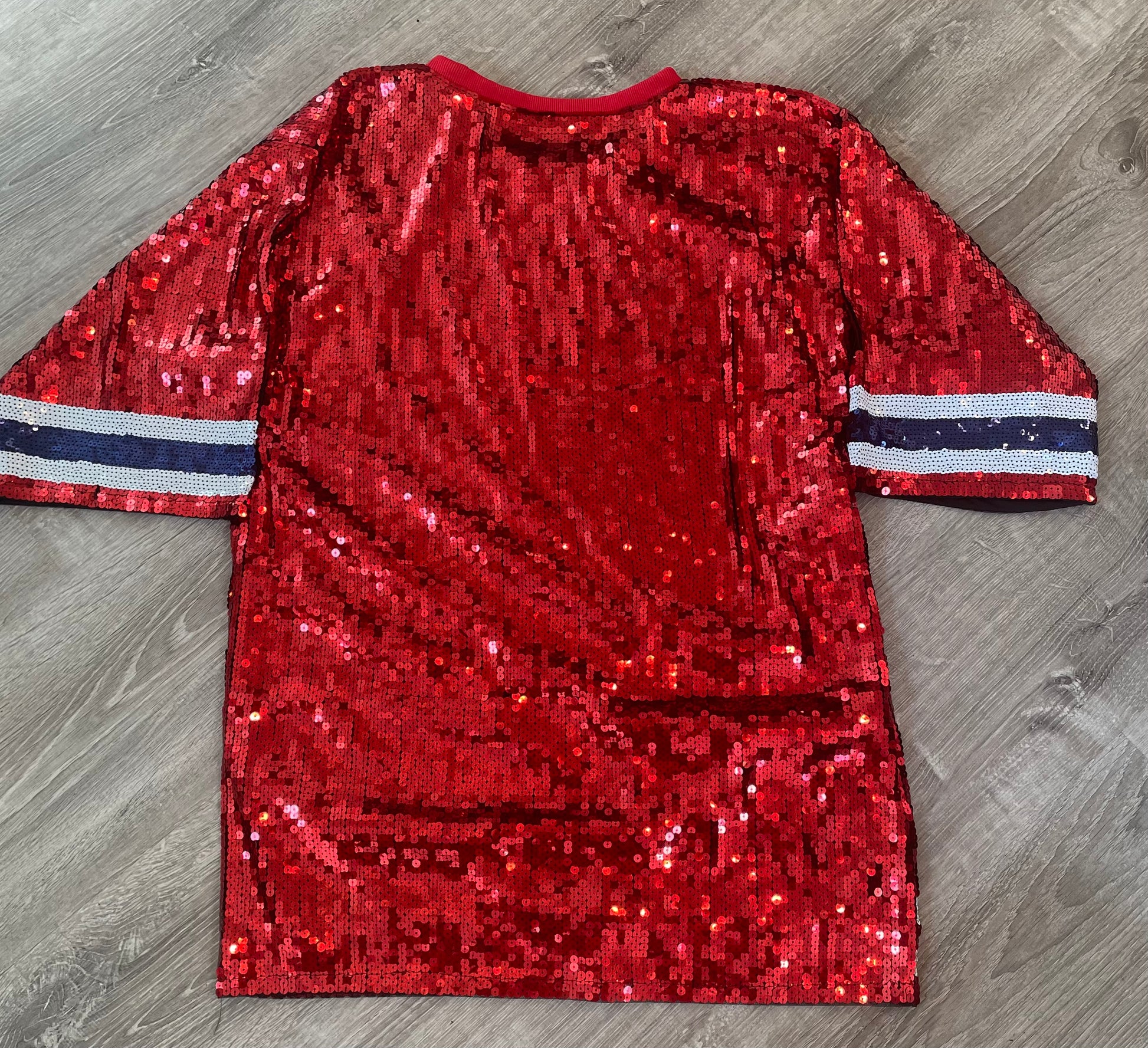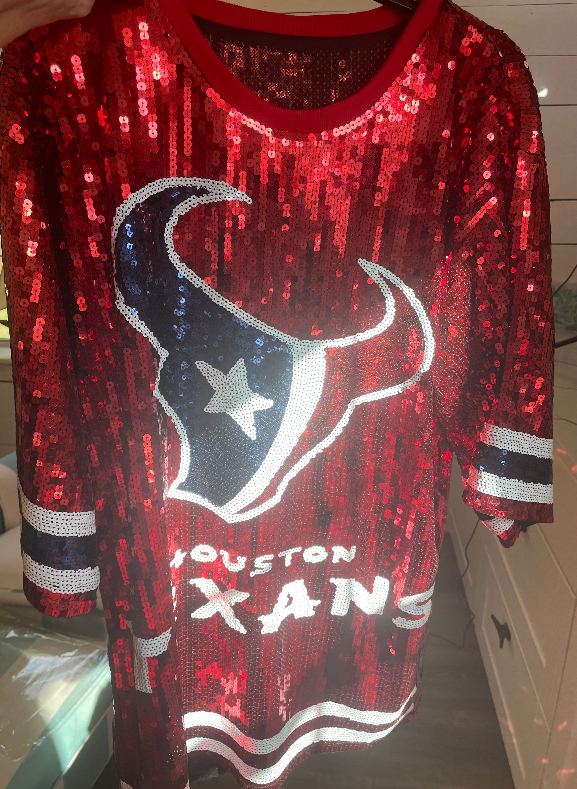 The ultimate game day fashion statement that combines team spirit with glamorous style! Get ready to dazzle in the stands and turn heads with every step you take. Sparkling Sequin Magic: This dress is adorned with high-quality sequins that shimmer and shine with every move. Stand out from the crowd and let your Texans pride sparkle like never before! 🏈 Show Your Team Love: Whether you're watching the game at the stadium, hosting a watch party, or cheering from your living room, this jersey dress is the perfect way to express your unwavering support for the Houston Texans. 👗 Comfort Meets Style: Made from soft and breathable materials, our jersey dress ensures all-day comfort while looking fabulous. It's not just a statement piece; it's a comfortable and versatile addition to your wardrobe. 🔥 Trendy and Versatile: This dress isn't just for game day! Pair it with sneakers for a casual chic look, or dress it up with heels and accessories for a night out. It's a versatile piece that suits any occasion. 🎁 Perfect Gift Idea: Searching for the ideal gift for the Texan fan in your life? Look no further! Our sequin jersey dress is a unique and thoughtful gift that'll have them cheering in style.