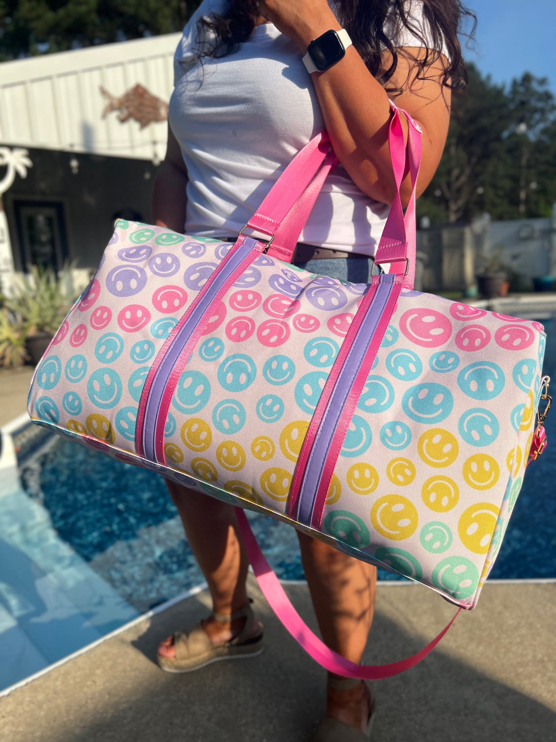 This bag will sure to make you happy that it is the weekend. Bright vibrant smiling emojis put a smile on your face. This bag is perfect for your next getaway, with plenty of room to pack "all that make you happy".