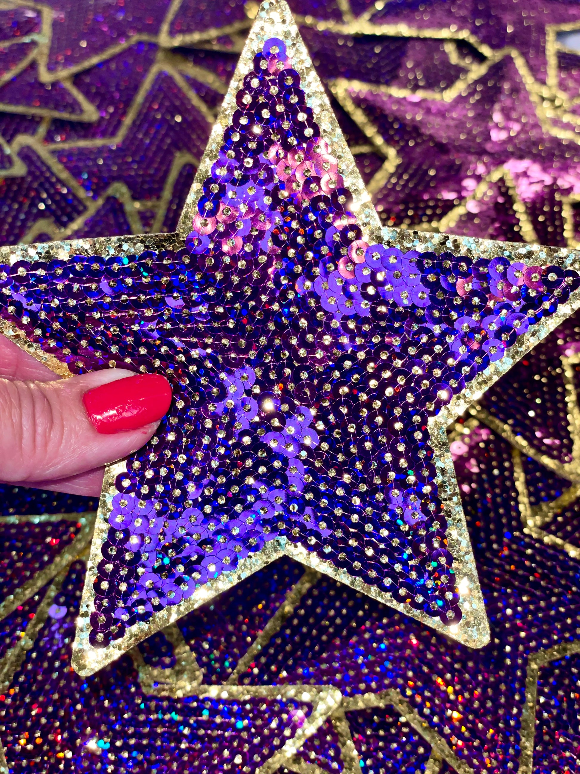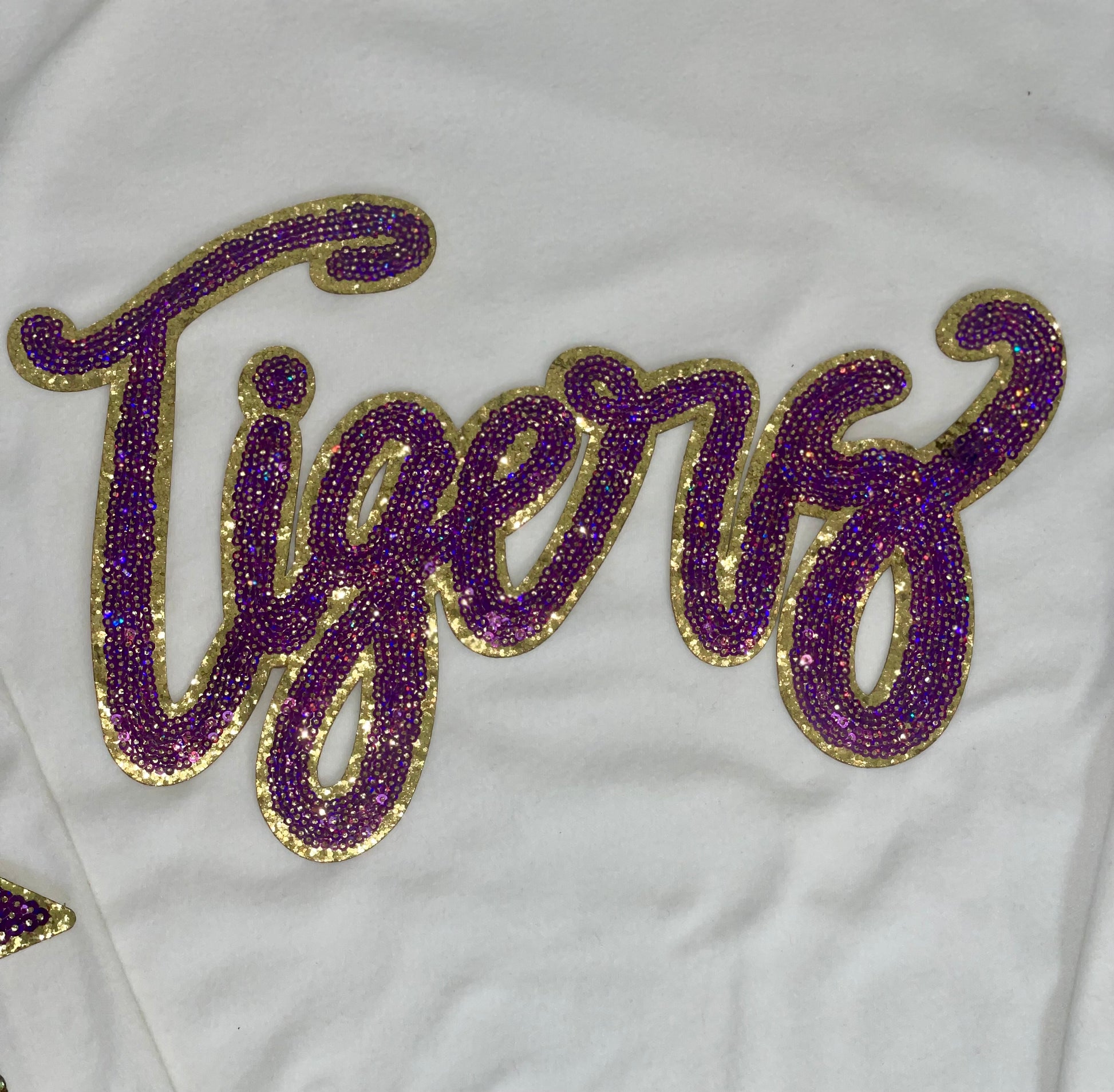 Tigers Purple Sequin Game Day Iron On Patch with Gold backing size 11in wide x 7in height. Purple sequin star size 5 inches wide with Gold glitter backing. These come with adhesive backing that is heat activated, we recommend applying with a heat press. Can be used on: - Hats - Apparel - Bags